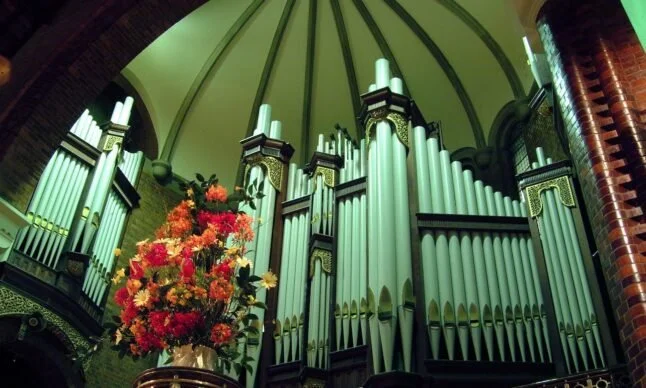 The arched tiered chancel, pipe organ, choir and fine ecclesiastical furniture are impressive.